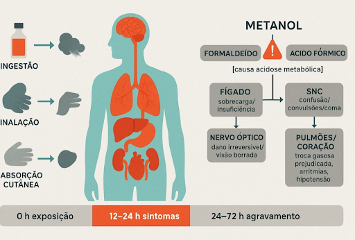 Os efeitos podem surgir de 12 a 24 horas após a exposição, dificultando o diagnóstico precoce. Em geral, o envenenamento por metanol afeta o corpo da seguinte forma: